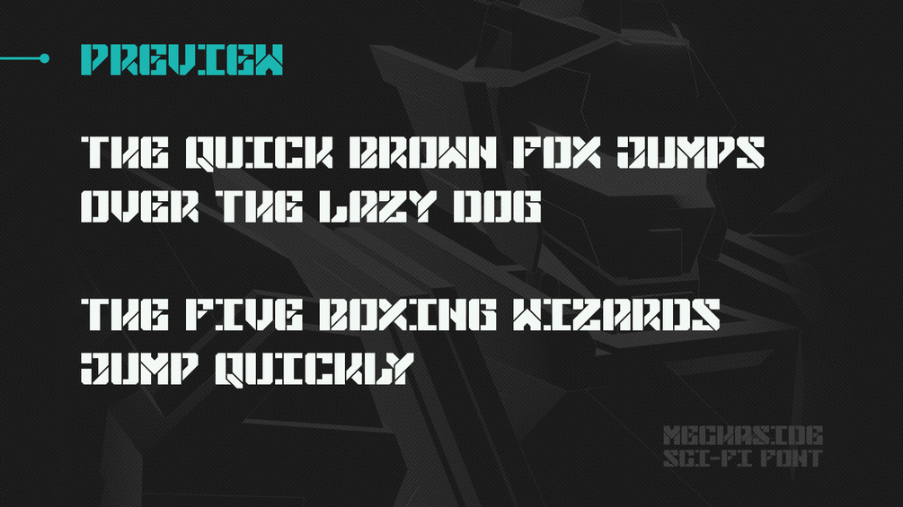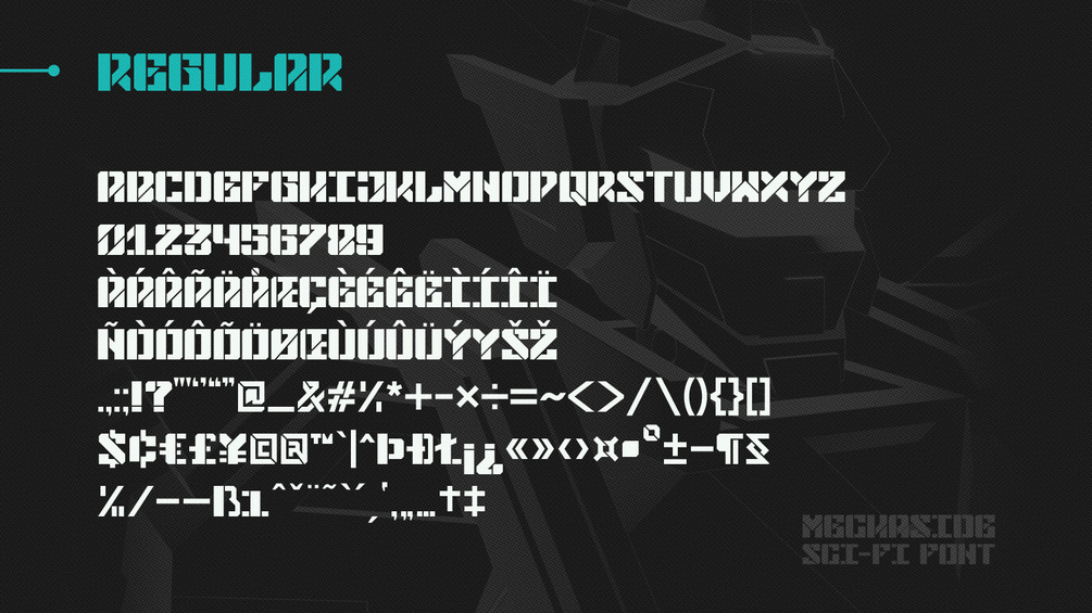 Mechaside is a typeface that works well for sci-fi themes, mecha/robots, technology, video games, etc. Made with geometric shapes and stenciled cuts in several places.