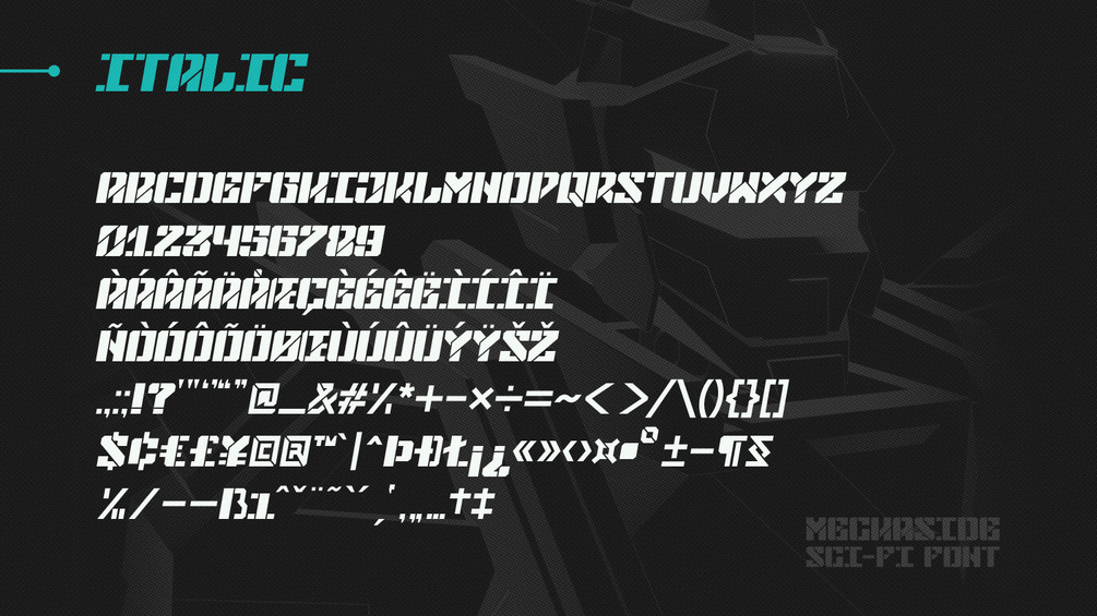 Mechaside is a typeface that works well for sci-fi themes, mecha/robots, technology, video games, etc. Made with geometric shapes and stenciled cuts in several places.